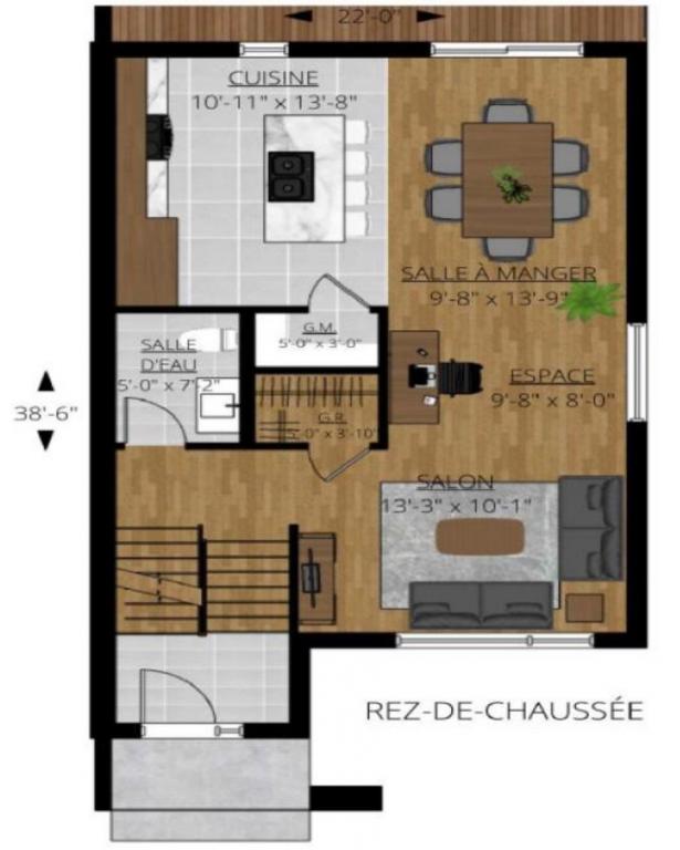 Rez-de-chaussée: plafond 9’, aire ouverte, grande cuisine avec îlot central et comptoir en granit, salon, espace pouvant servir de bureau, grande terrasse de 18'x10' et cour extérieure intime sans voisin à l’arrière. 2 stationnements.
