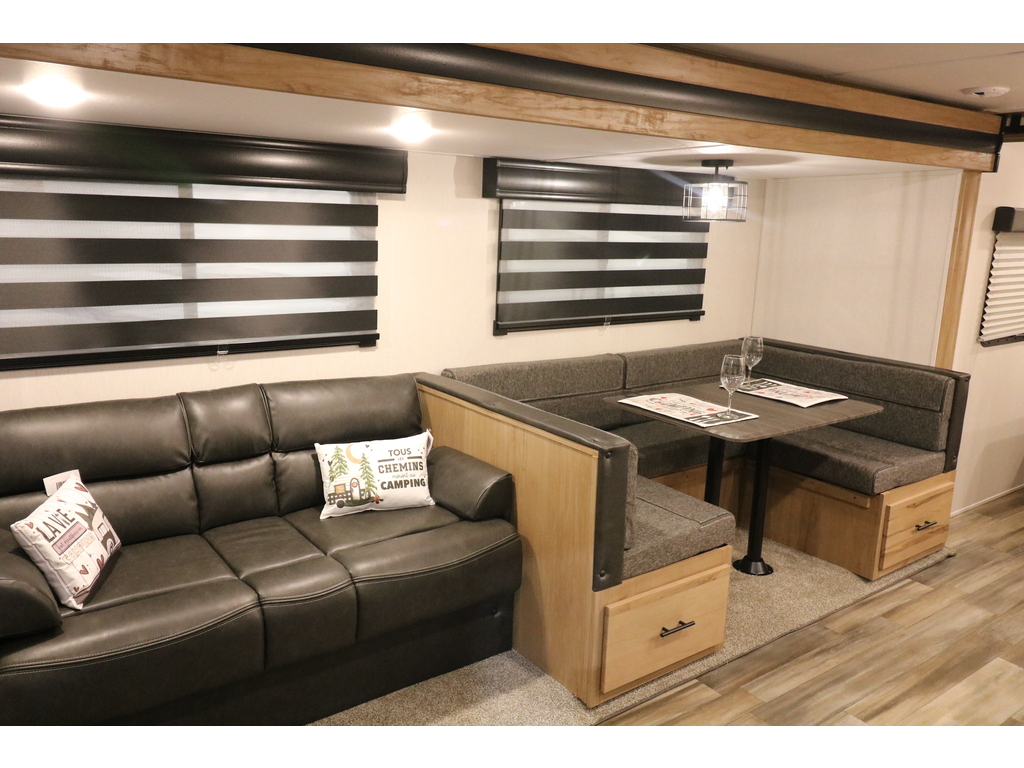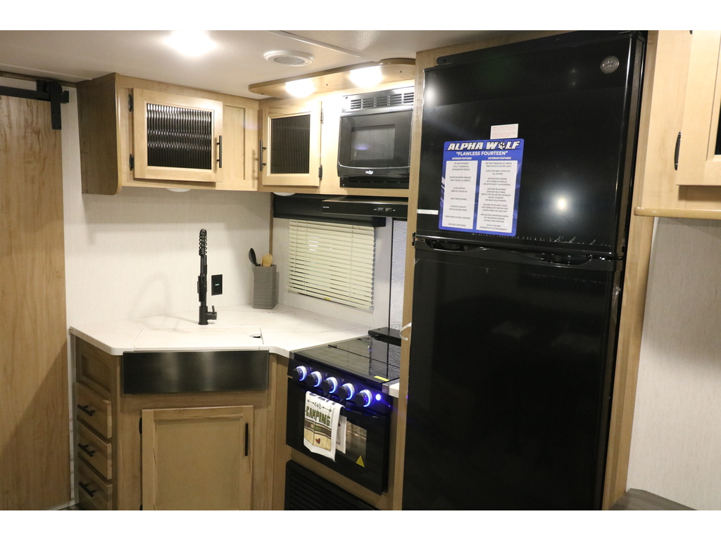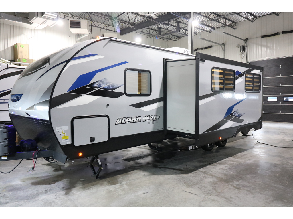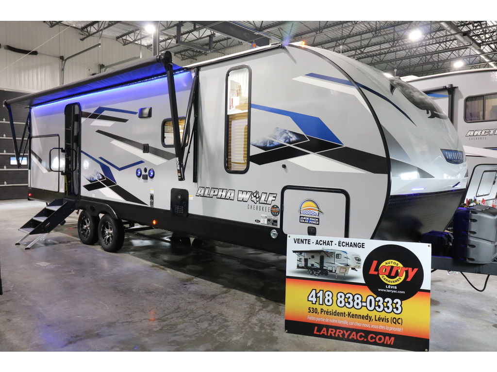 Alpha Wolf 26RB 2023. Roulotte idéale pour un couple. La chambre avant est fermée par une porte style grange et comporte un lit queen et un garde-robe de chaque côté du lit. La cuisine est munie d'un grand évier profond, une cuisinière et un four avec dessus vitré et sans oublier le grand réfrigérateur et le grand garde-manger. Dans la partie de l'extension, vous avez une dinette en U ainsi qu'un sofa. Tous les deux se transforme en lit supplémentaire pour les invités. Cette roulotte a un contrôle électronique de la température ainsi qu'un beau foyer électrique. Vous trouverez une très grande fenestration dans cette roulotte. Vous serez enchanté par la grande salle de bain complète, avec beaucoup de rangement, vanité, pharmacie et même un mur avec crochets pour serviette . Cette roulotte est aussi très bien équipée pour profiter de l'extérieur avec sa grande cuisinette extérieure et son auvent électrique avec lumières leds et ses haut-parleurs extérieurs. Elle est dotée de marches ultra-robustes et pour faciliter la vie, il y a un vérin avant électrique et beaucoup de rangement extérieur. Financement facile sur place. LARRY AUTOS CARAVANES 530 Rte Président Kennedy Lévis 418-838-0333 *Photos à titre indicatif