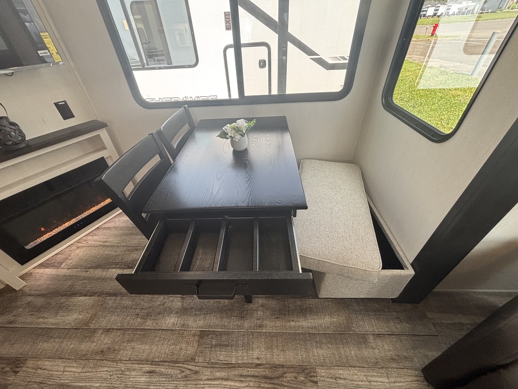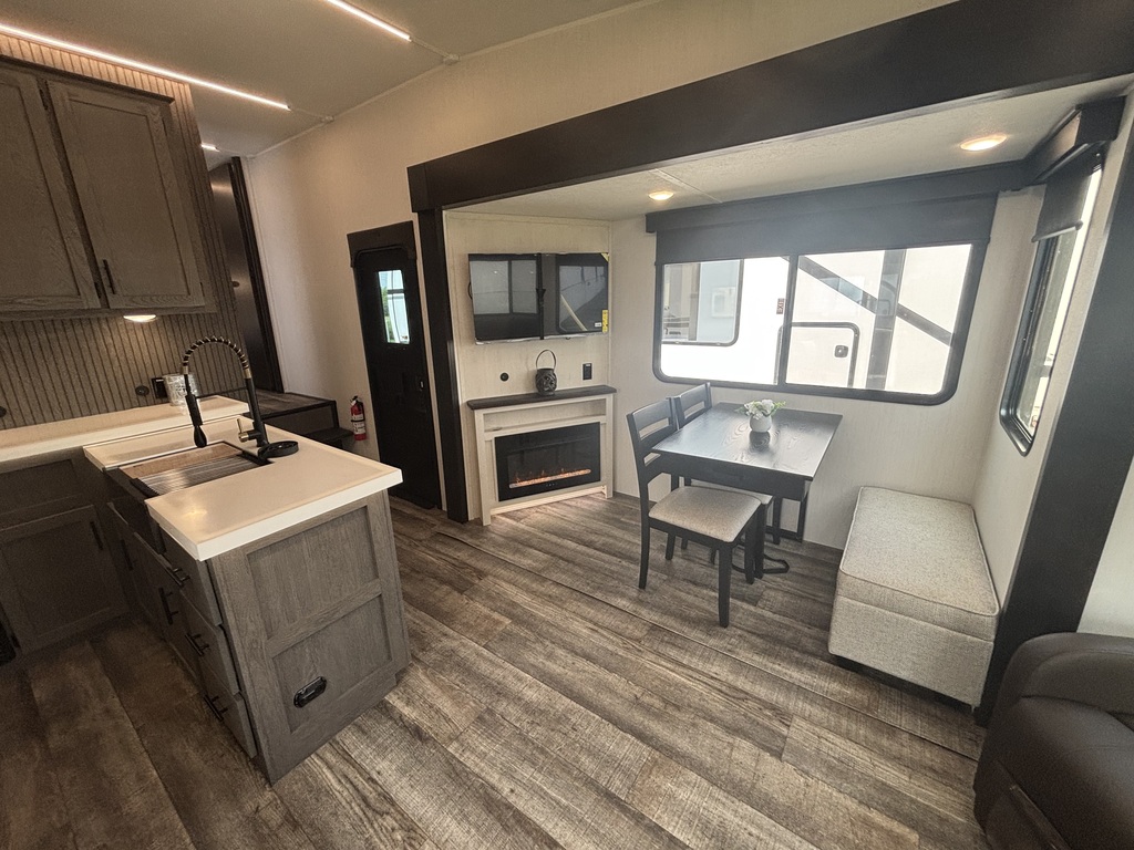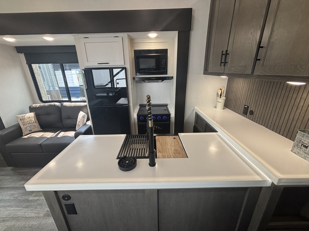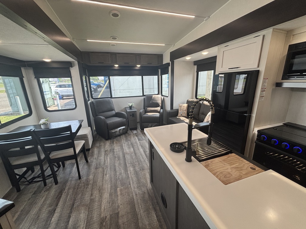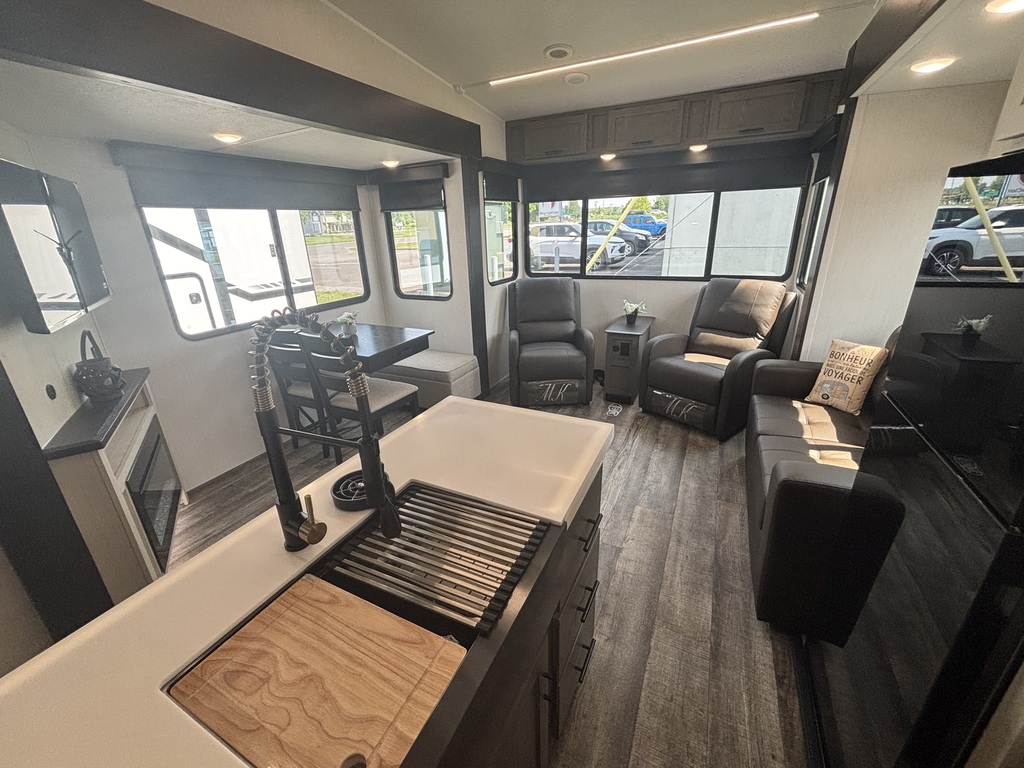 COMMANDEZ-MOI!!! ARCTIC Wolf 27 SGS 2026. Roulotte à sellette parfaite pour un couple! Elle pèse 7900lbs. La cuisine est entièrement équipée. Elle est munie d'un îlot central, d'un grand réfrigérateur, d'un four, d'un micro-ondes, d'un grand évier en acier inoxydable, ainsi que plusieurs armoires de rangement. À l'arrière vous retrouverez le salon équipé de deux fauteuils , d'un sofa-lit ainsi que d'un beau foyer électrique. Juste à côté du foyer se trouve la table avec deux chaises et en face une petite banquette qui peut recevoir deux personnes assises. À l'avant de l'unité, se trouve la chambre des maîtres. Elle est équipée d'un matelas queen et de rangement de chaque côté du lit ainsi que d'un garde-robe en face du lit. Dans la salle de bain, vous avez une belle douche vitrée avec pommeau de douche de qualité supérieure et une belle vanité avec rangement. Une belle nouveauté pour ce modèle 2025 un coup de pied aspirateur pour ramasser les saletés est inclus dans la roulotte . Cette roulotte est équipée d'un système de nivellement automatique, de marches solides et d'un très grand espace de rangement. Financement disponible sur place *Photos à titre indicatif*