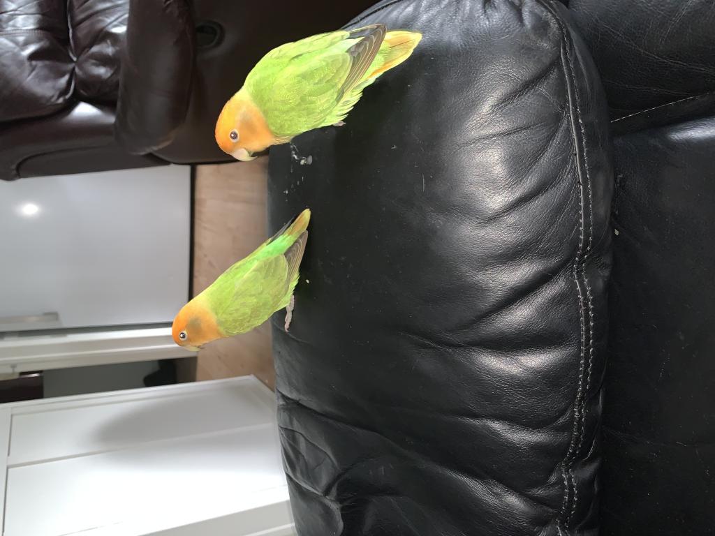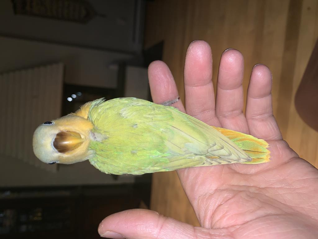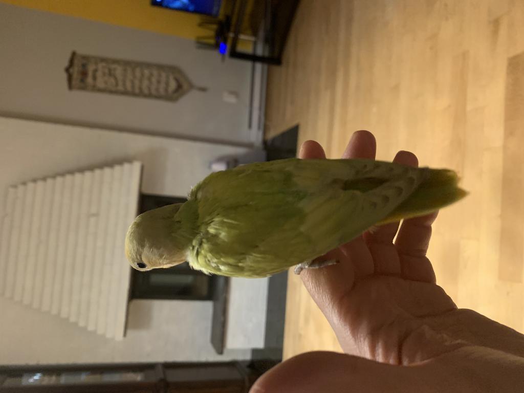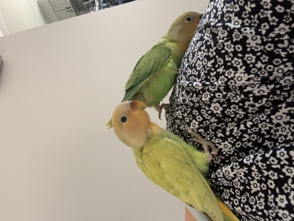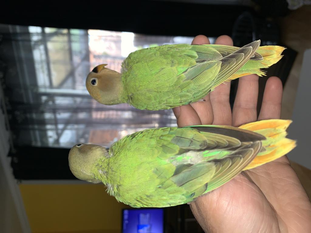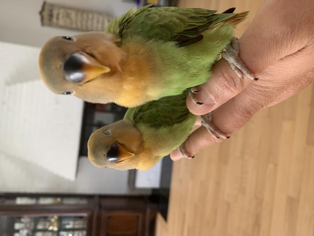 Trois inséparables, leurs têtes est orange et leurs cou aussi, ils commencent à manger seuls et on les nourris aussi. Ils sont manipulables, on connaît pas leurs sexe. Deux ressembles exactement à leurs parents et un sa couleur est entre le vert et le jaune. Dernière photo c’est la photo des parents. J’habite à repentigny 130$ chaque