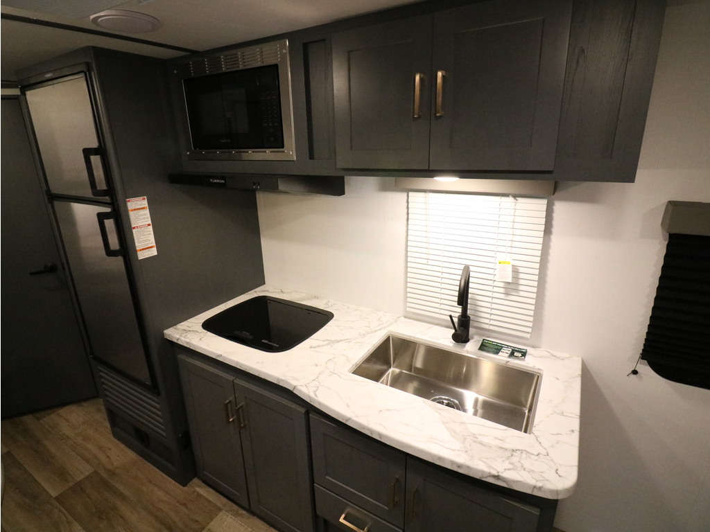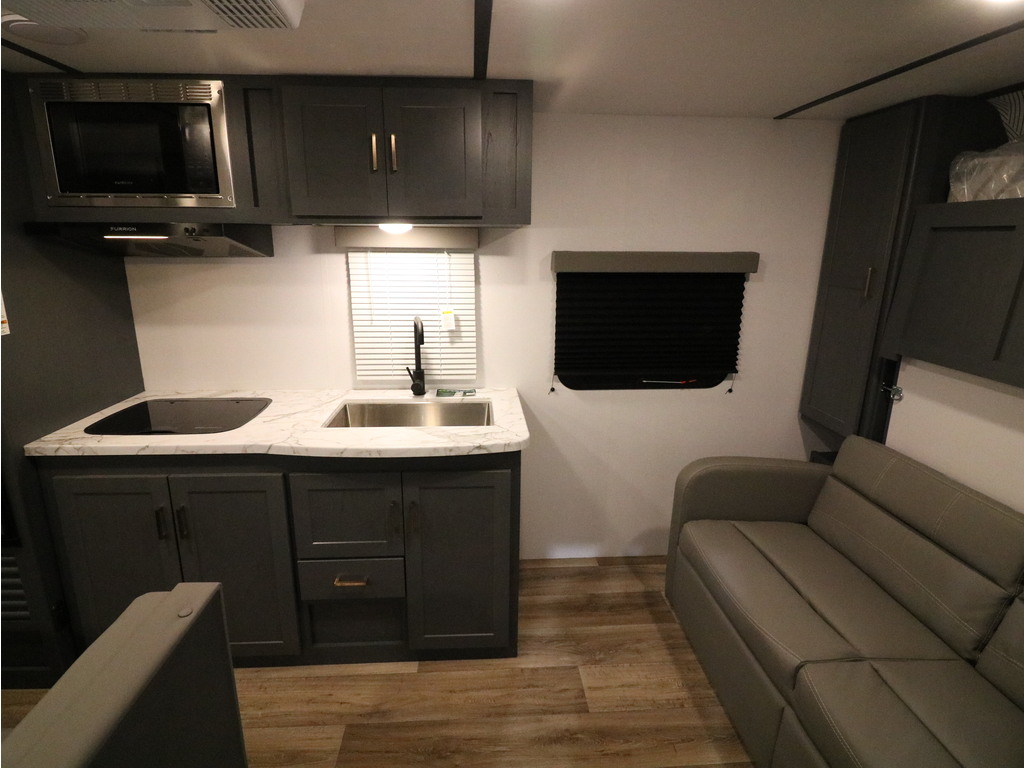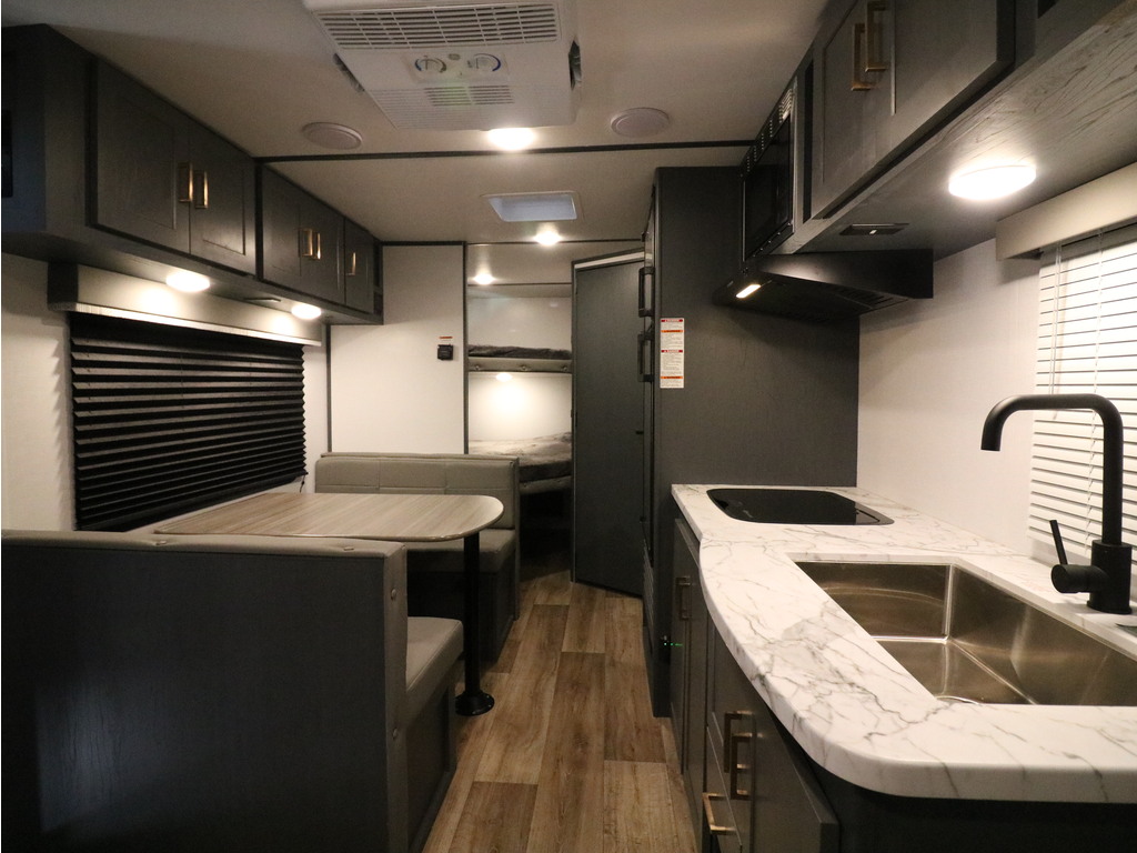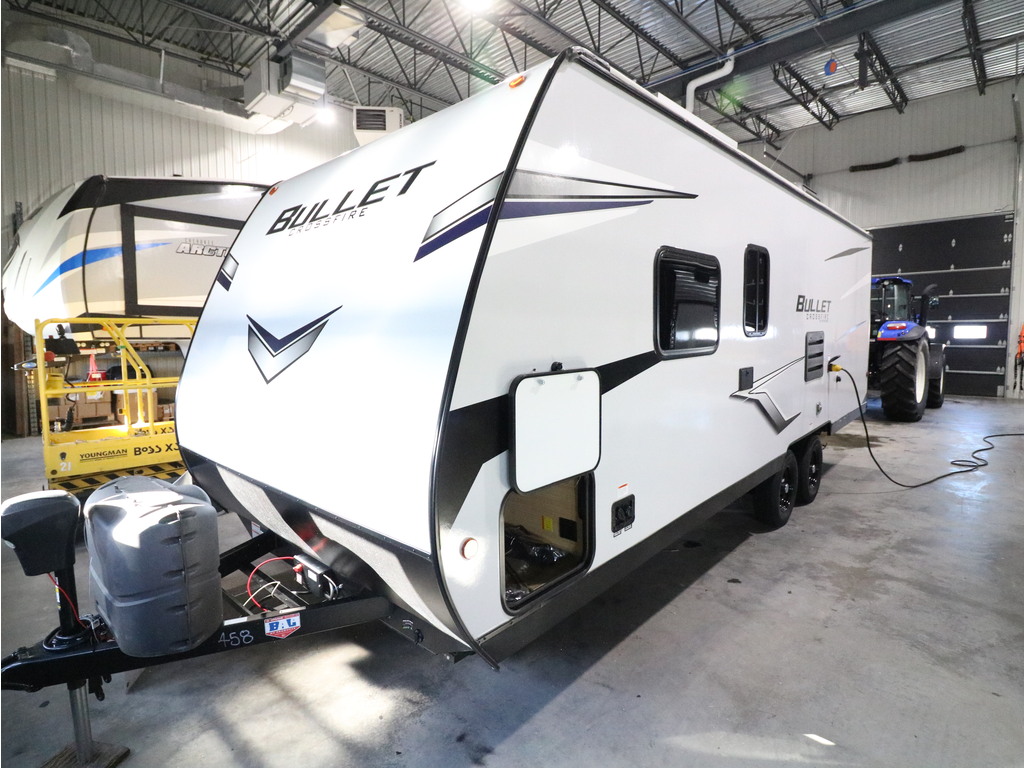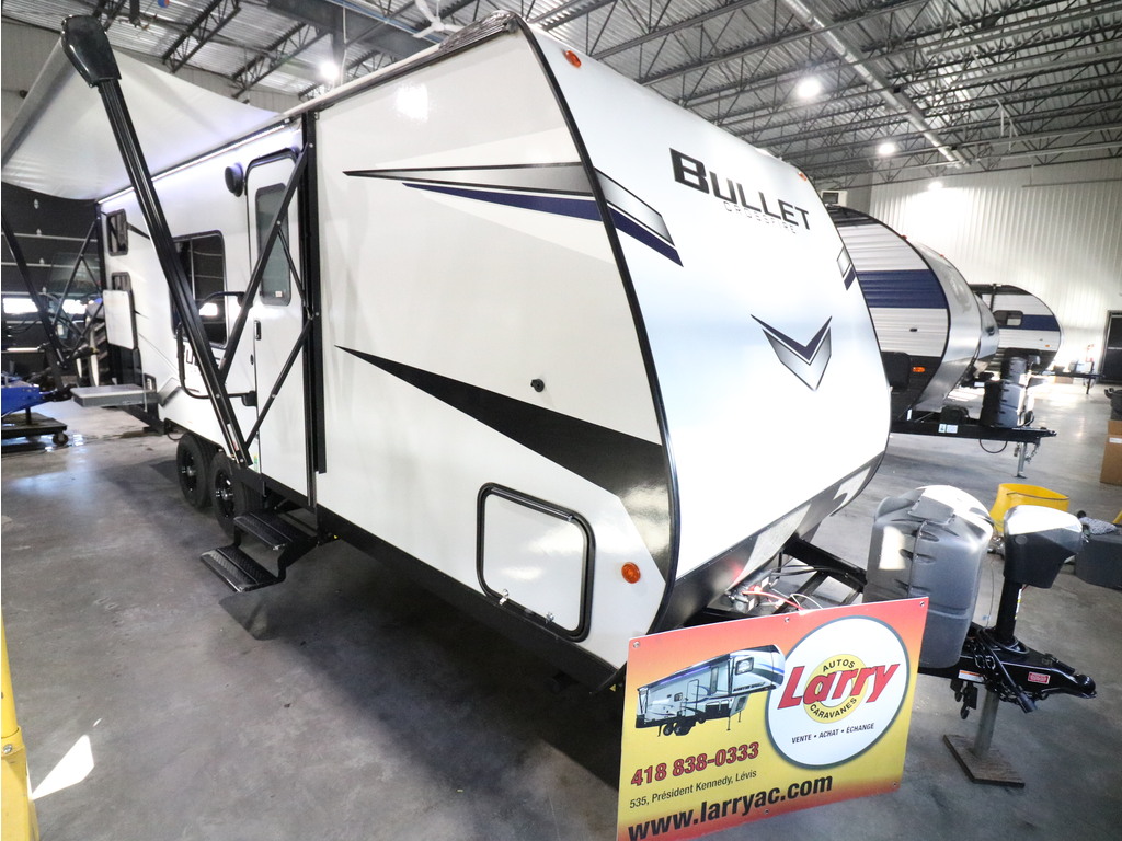 Bullet 2200BH 2022. Roulotte parfaite pour la famille de structure en aluminium avec revêtement en fibre de verre. Elle a un poids de seulement 4400 lbs. C'est une superbe roulotte avec des lits superposés double pour les enfants. Il y a une belle banquette en cuir avec une grande fenêtre devant. Aussi l'espace cuisine est très fonctionnelle avec un évier double profond, un micro-onde, des ronds de poêle avec dessus vitré et un grand réfrigérateur avec congélateur à part. Vous serez heureux d'avoir un lit murphy qui mettra à votre disposition un lit queen sinon en une fraction de seconde un superbe divan en cuir très pratique pour les jours de pluie. Cette roulotte dispose de beaucoup de rangement. Elle a une grande salle de bain avec bain douche. Cette roulotte est parfaite pour passer du bon temps à l'extérieur grâce à l'auvent électrique et à la petite cuisine extérieure. Financement facile sur place. *Photos à titre indicatif*