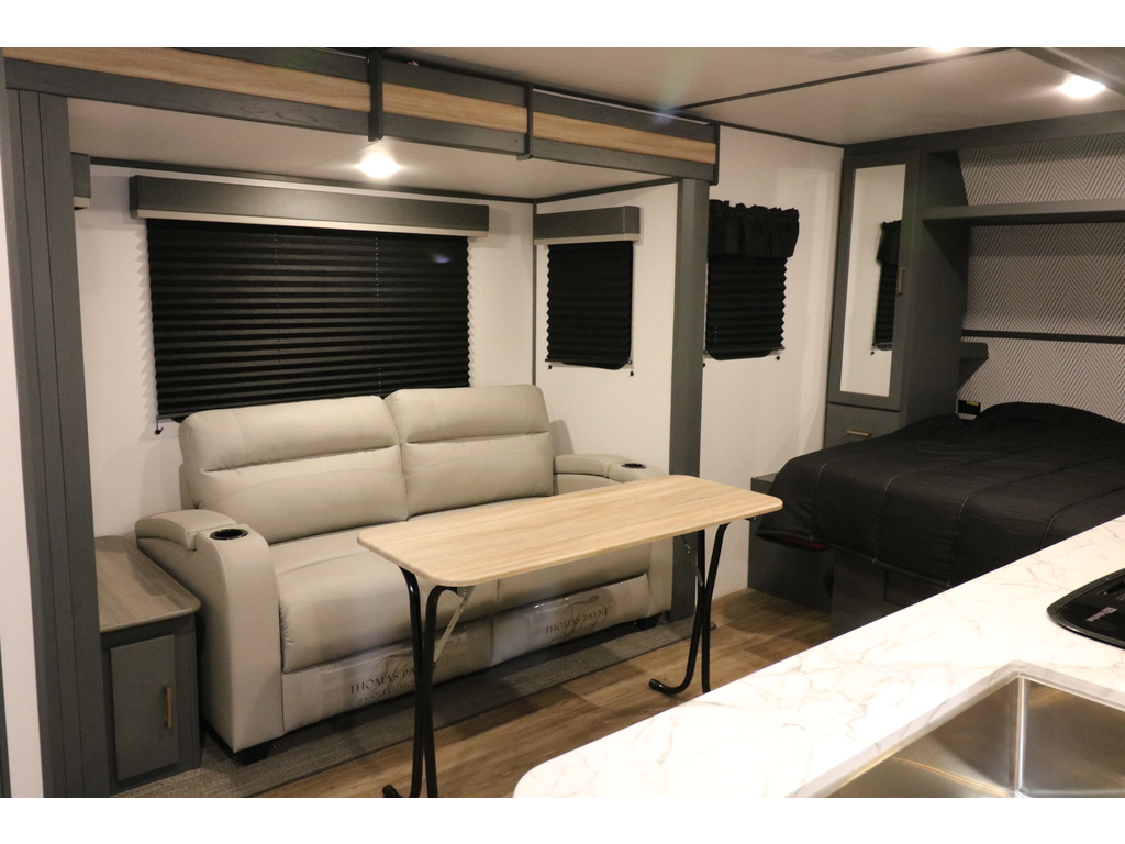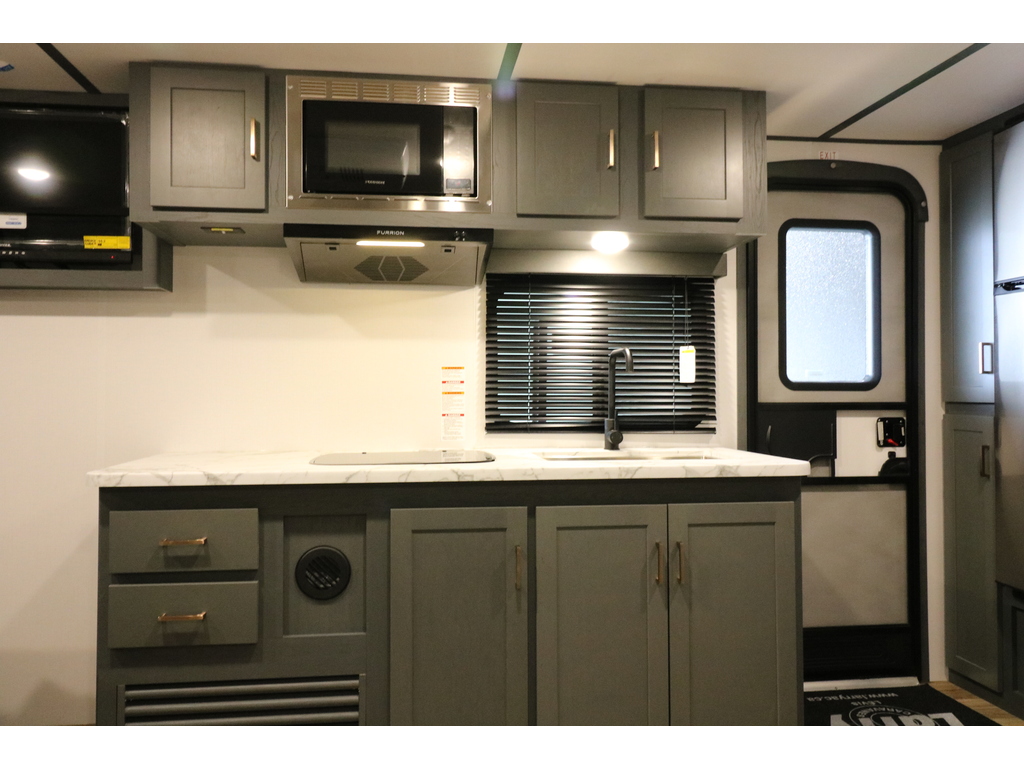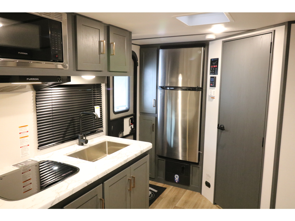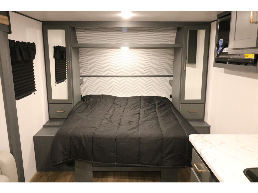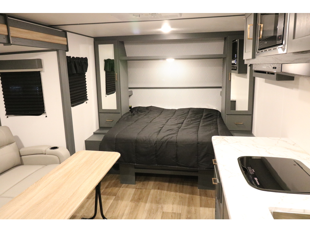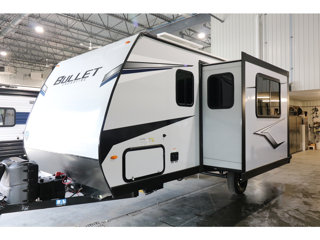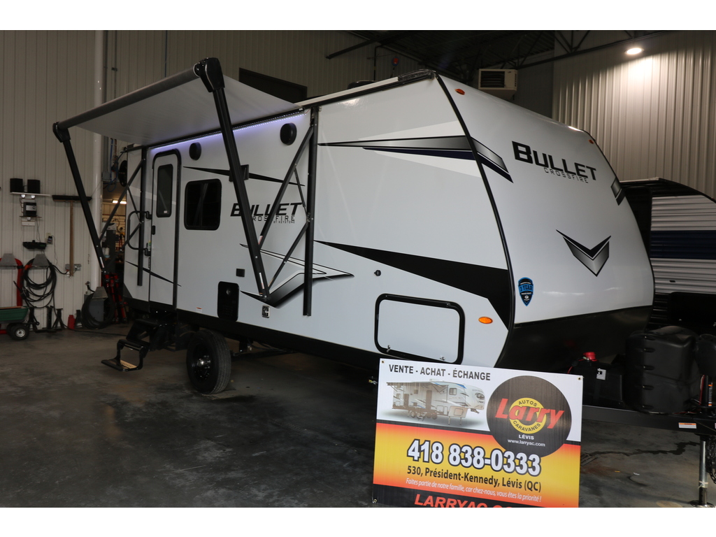 Bullet 1850RB 2023. Roulotte idéale pour un couple. De construction en aluminium et fibre de verre, elle a un devant aérodynamique. Son poids est de seulement 4300 lbs. Elle est très pratique car elle a un divan en cuir qui se transforme en lit pour les invités ainsi qu'une table que vous pouvez ranger à votre guise lorsque l'heure du repas est terminé. Elle possède également un téléviseur pour vous divertir. Vous serez enchanté par son évier double en stanless ainsi qu'un grand réfrigérateur et un dessus vitré sur les ronds de poêle. Elle a beaucoup de rangement. Cette roulotte a une belle salle de bain avec douche en coin, un lavabo et une petite pharmacie . Cette roulotte est parfaite pour passer du bon temps à l'extérieur grâce à l'auvent électrique ainsi que les vérins électriques pour plus de facilité. Financement facile sur place.