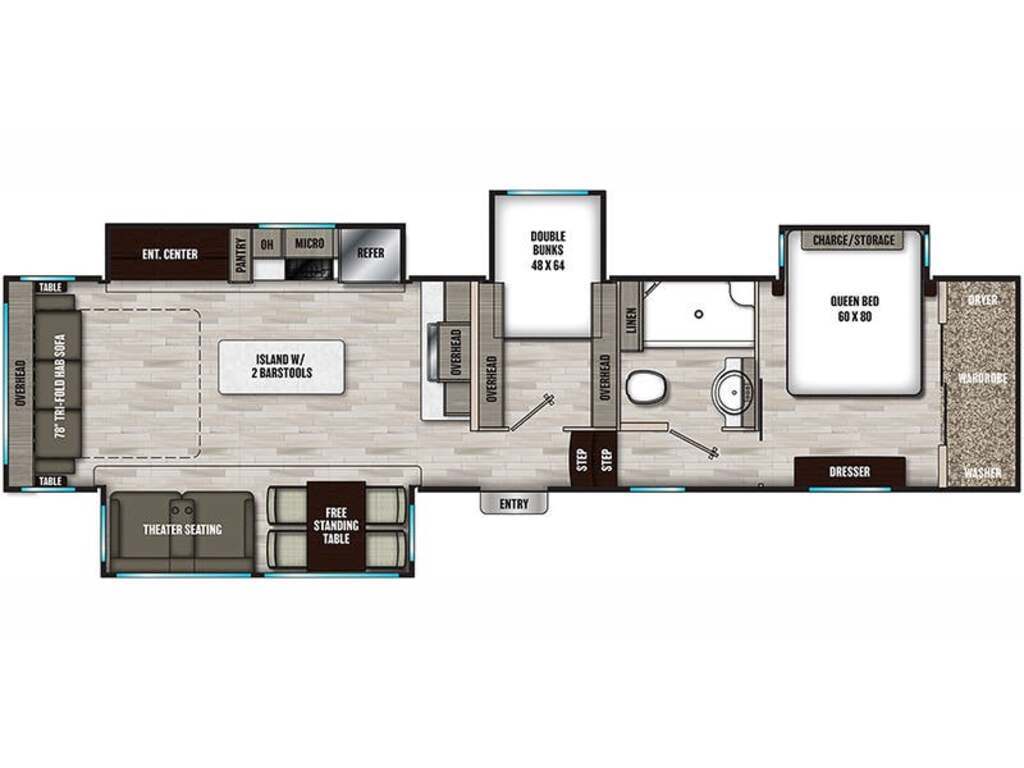 Options : Jantes aluminium, Climatiseur au plafond, Ventilateur au plafond, Vérin stabilisateur, Douche extérieure, Échelle, Attache-remorque, Douche, Toilette, Lit queen-size, Prise électrique, Cric électrique, Détecteur LPG/CO2, Téléviseur, Chaine stéréo, Prise cable, Antenne pour téléviseur, Micro-onde, Cuisinière, Four, Fourneau, Auvent, Chauffe-eau, Lecteur DVD
