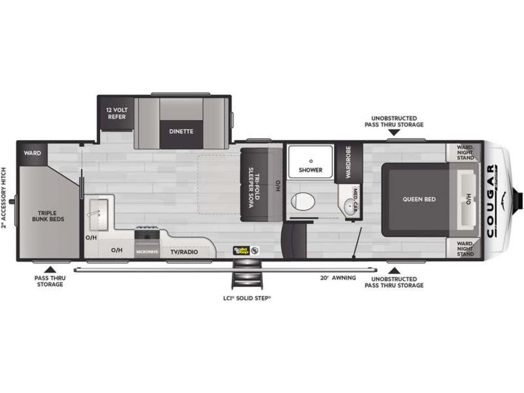 Options : Climatiseur au plafond, Ventilateur au plafond, Douche, Toilette, Lit queen-size, Lits superposés, Canapé-lit, Prise électrique, Détecteur LPG/CO2, Téléviseur, Chaine stéréo, Prise cable, Micro-onde, Cuisinière, Four, Hotte, Fourneau, Auvent, Chauffe-eau