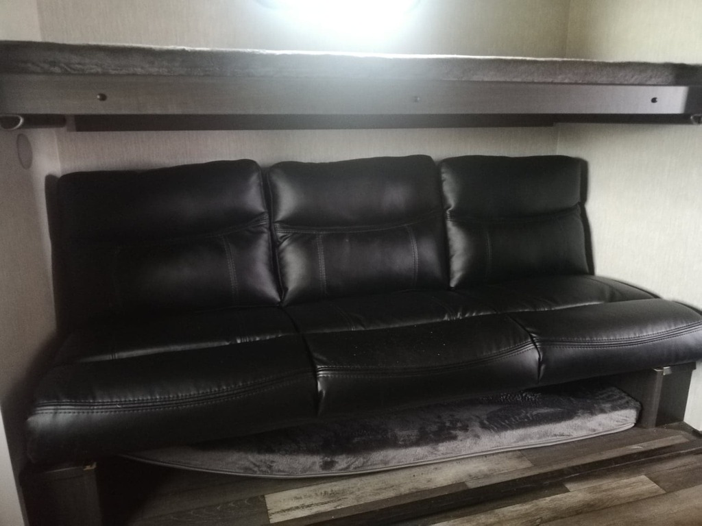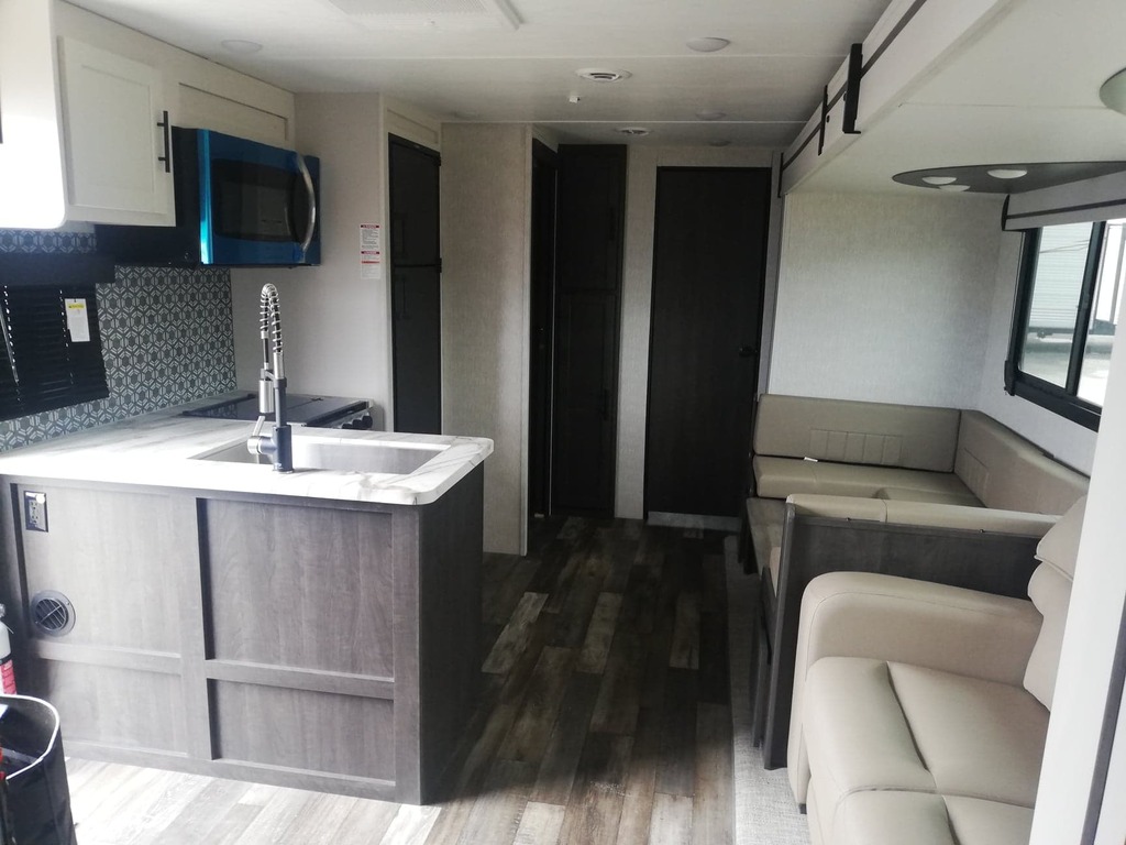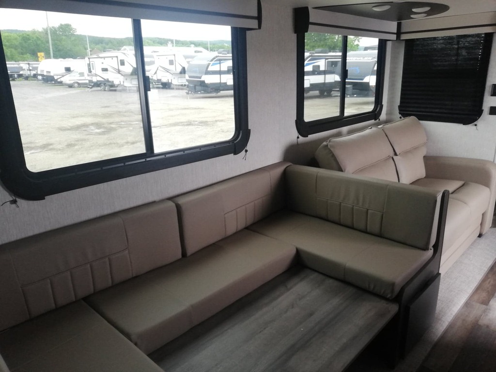 Très belle roulotte qui peut accueillir jusqu'à 10 personnes à coucher. A l'avant de la roulotte, une grande chambre avec garde-robe et lit king. Cette chambre est attenante à la salle de bain. Il y a deux accès à l'intérieur dont un qui mène directement dans la salle d'eau. A l'arrière , une autre chambre avec un sofa convertible et des lits superposés. Dehors, une cuisine extérieure avec évier et frigo. VENEZ NOUS VOIR CHEZ ROULOTTES TURMEL 7010 BOUL. STE ANNE A CHATEAU-RICHER ! ROULOTTE E. TURMEL, une entreprise familiale fondée en 1996, le seul endroit à Québec où vous pouvez gagner votre achat! Nos prix incluent les préparations, nettoyage intérieur, extérieur, inspection complète, kit de départ et formation pour unités neuves ou usagées! Soyez assurés d’obtenir un service courtois, accueillant, à la hauteur de vos attentes par tout notre personnel compétent et dévoué! Notre entreprise de cesse d’évoluer et d’innover dans le domaine. Notamment par sa croissance dans le marché du véhicule récréatif et en se démarquant avec la qualité de ses produits et de son service tout en vous transportant dans une vie calme, relaxante en plein nature! Les couleurs et matériaux de l'unité en stock pourraient différer un peu de cette visite virtuelle.