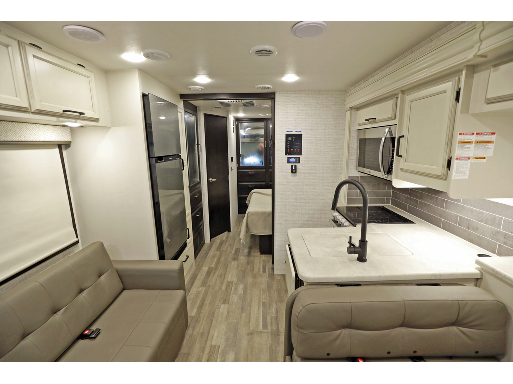 Entegra Vision 27A 2 extension , lumières LED améliorées sous le comptoir et au-dessus du fascia, profil de caméra de vue arrière , . Ce magnifique VR comprend 2 extensions, un lit king size, un aménagement confortable et spacieux, des vérins de nivellement hydrauliques automatiques, un châssis Ford F53. Ce véhicule de plaisance étonnant comprend un ensemble valeur client qui comprend des caméras de recul et de vue latérale, un auvent électrique avec lumières LED, un centre de divertissement extérieur avec TV et DVD / radio, un système d'infodivertissement, une télévision LED dans le salon, des stores à rouleau, un toit en fibre de verre couronné sans couture et auvents à couvercle coulissant. L'équipement en option comprend une couchette avant. La liste impressionnante de caractéristiques standard de la Vision qui le distingue vraiment de la concurrence comprend la garantie inégalée de 2 ans d'Entegra, un cap avant en fibre de verre d'une seule pièce, un pare-brise panoramique avec pare-brise électrique, un toit en fibre de verre couronné sans couture, un roulement à billes guides de tiroirs, grande douche et bien plus encore Entegra Vision 27A 2 slides New exterior graphics package, bed outlets added to inverter, upgraded LED lights below countertop and above fascia, upgraded sleeker rear view camera profile, new hardwood fascia, and all theater seating has been upgraded to a center console with cup holders. This beautiful RV features 2 slide-out rooms, king size bed, a comfortable, spacious layout, automatic hydraulic leveling jacks, Ford F53 chassis. This amazing RV boasts Customer Value Package which features backup & side-view cameras with monitor, electric awning with LED lights, exterior entertainment center with TV & DVD/radio, infotainment system, LED TV in living room, roller shades, seamless crowned fiberglass roof and slide-out cover awnings. Optional equipment includes a front overhead bunk. The Vision's impressive list of standard features that truly set it apart from the competition include Entegra's unparalleled 2 year warranty, one-piece fiberglass front cap, panoramic windshield with power shade , seamless crowned fiberglass roof, ball-bearing drawer guides, large shower and much more