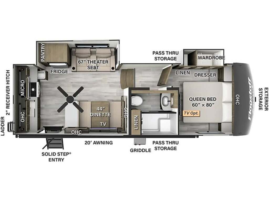 Options : Réservoir de propane, Climatiseur au plafond, Ventilateur au plafond, Vérin stabilisateur, Douche, Toilette, Lit double, Canapé-lit, Prise électrique, Détecteur LPG/CO2, Téléviseur, Chaine stéréo, Prise cable, Micro-onde, Cuisinière, Four, Hotte, Fourneau, Auvent, Chauffe-eau, Antenne parabolique, Chauffe-eau à allumage direct