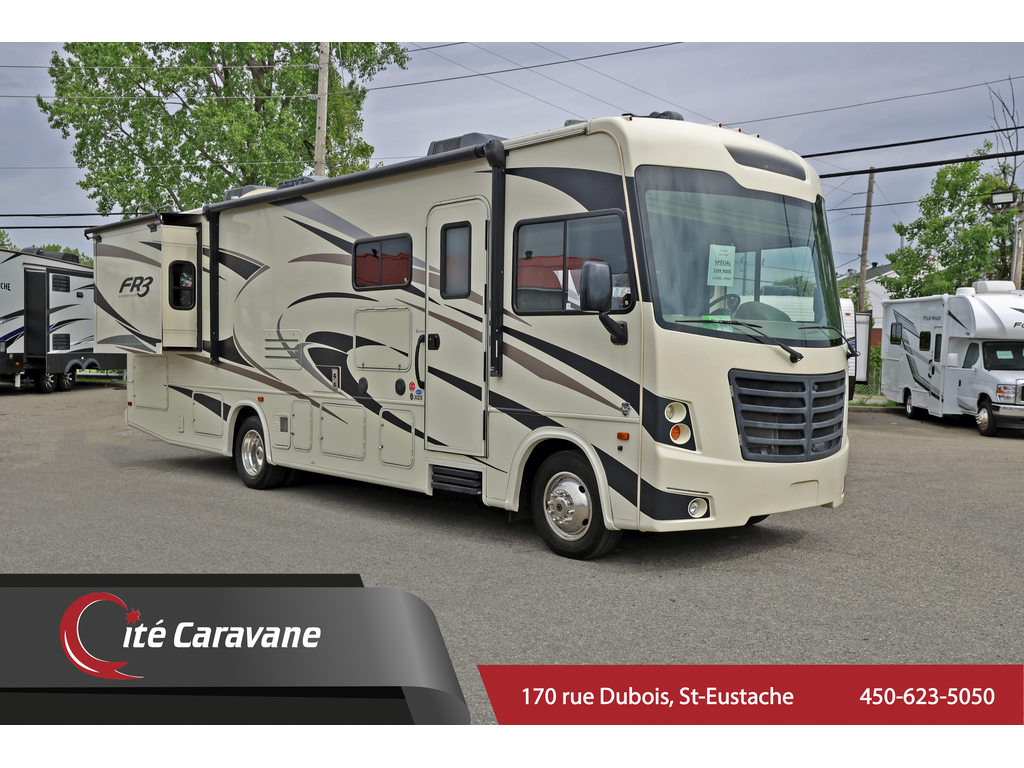 Forest River FR3 2018 30DS avec bas millage. Classe A munit de 2 extensions, camera latéral et arrière, Hitch 5000LBS, slide toper, devant mouler en fibre de verre avec parebrise d’un seul morceau, max-air, Génératrice, Télévision extérieur avec hautparleurs, auvent électrique, 2 A/C au toit, Crics Hydrauliques, 2 bancs avant pivotants, lit en haut des bancs conducteurs, Frigo 4 ports, évier double en Stainless, sofa en cuirette, dinette , porte de douche en vitre, lit KING et encore plus !! 1124$/Mois+Txs www.citecaravane.com 450-623-5050 170 rue dubois St-eustache J7P 4W9 Forest River FR3 2018 30DS with low mileage. Class A with 2 slide out, side and rear camera, Hitch 5000LBS, slide toper, fiberglass molded front with one piece windshield, max-air, Generator, Outdoor TV with speakers, electric awning, 2 A/C on the roof, Hydraulic jacks, 2 swivel front seats, Overhead bed, 4 door fridge, stainless steel double sink, leatherette sofa, dinette, shower with glass door, KING size bed and much more !! 1124$/Month+Txs www.citecaravane.com 450-623-5050 170 rue dubois St-eustache J7P 4W9