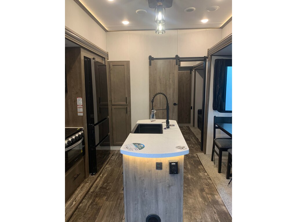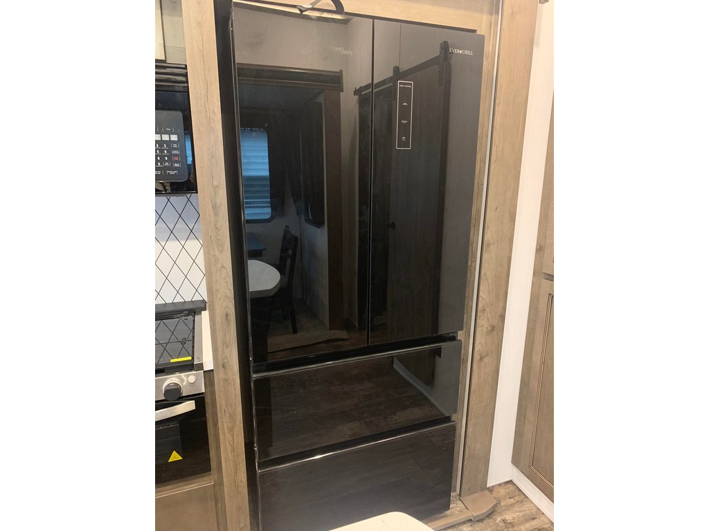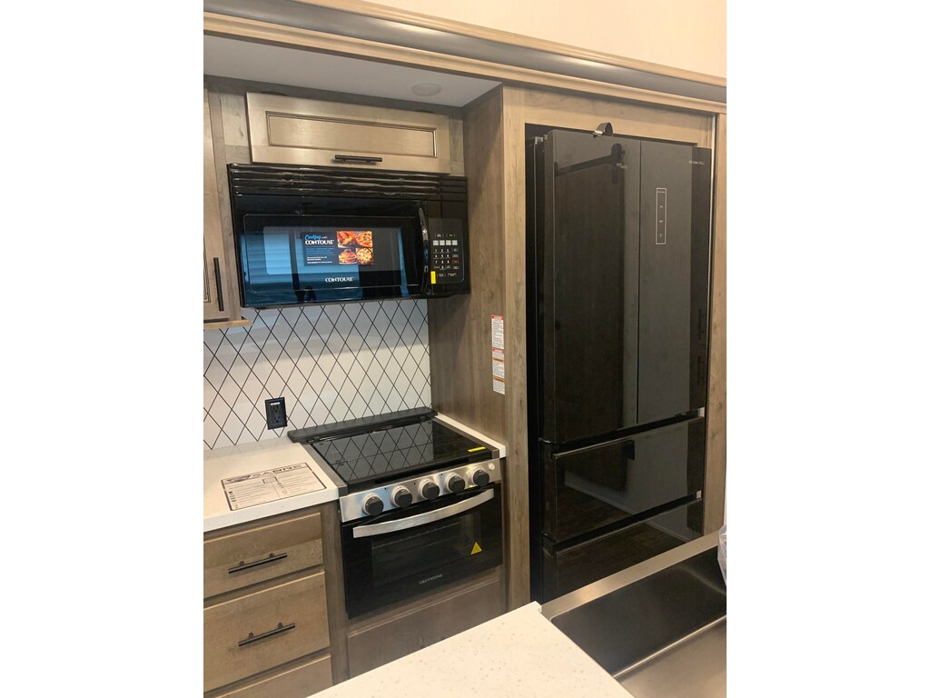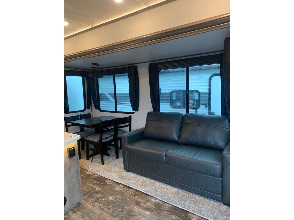 Grande chambre avec lit king size à l'avant, attenante à la salle de bain principale. A l'arrière, chambre avec sofa convertible et lits superposés, attenante à une deuxième salle de bain, plus petite mais avec douche et toilette. Deux portes pour accéder à la roulotte, dont un directement dans la petite salle de bain. Cuisine avec toutes les commodités nécessaires : frigo doubles portes, ilot avec évier, four, poêle et micro-ondes. Cuisine extérieure avec frigo, rangement, et poêle. VENEZ NOUS VOIR CHEZ ROULOTTES TURMEL 7010 BOUL. STE ANNE A CHATEAU-RICHER ! ROULOTTE E. TURMEL, une entreprise familiale fondée en 1996, le seul endroit à Québec où vous pouvez gagner votre achat! Nos prix incluent les préparations, nettoyage intérieur, extérieur, inspection complète, kit de départ et formation pour unités neuves ou usagées! Soyez assurés d’obtenir un service courtois, accueillant, à la hauteur de vos attentes par tout notre personnel compétent et dévoué! Notre entreprise de cesse d’évoluer et d’innover dans le domaine. Notamment par sa croissance dans le marché du véhicule récréatif et en se démarquant avec la qualité de ses produits et de son service tout en vous transportant dans une vie calme, relaxante en plein nature!