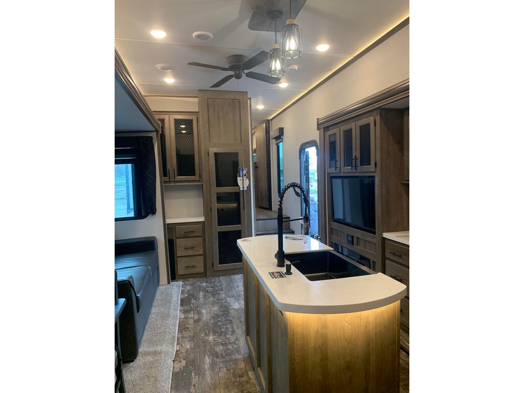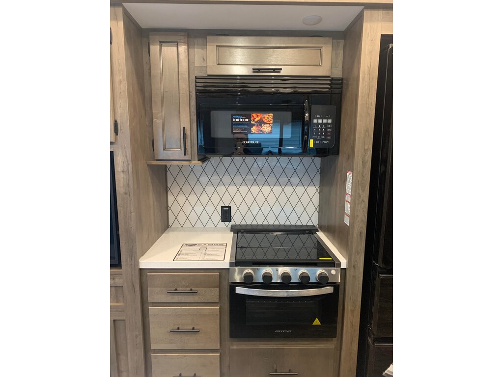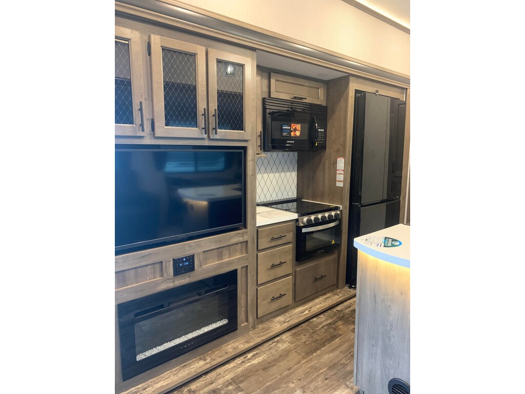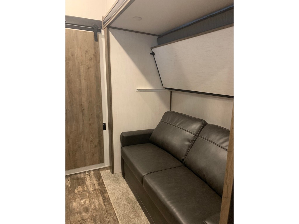 Grande chambre avec lit king size à l'avant, attenante à la salle de bain principale. A l'arrière, chambre avec sofa convertible et lits superposés, attenante à une deuxième salle de bain, plus petite mais avec douche et toilette. Deux portes pour accéder à la roulotte, dont un directement dans la petite salle de bain. Cuisine avec toutes les commodités nécessaires : frigo doubles portes, ilot avec évier, four, poêle et micro-ondes. Cuisine extérieure avec frigo, rangement, et poêle. VENEZ NOUS VOIR CHEZ ROULOTTES TURMEL 7010 BOUL. STE ANNE A CHATEAU-RICHER ! ROULOTTE E. TURMEL, une entreprise familiale fondée en 1996, le seul endroit à Québec où vous pouvez gagner votre achat! Nos prix incluent les préparations, nettoyage intérieur, extérieur, inspection complète, kit de départ et formation pour unités neuves ou usagées! Soyez assurés d’obtenir un service courtois, accueillant, à la hauteur de vos attentes par tout notre personnel compétent et dévoué! Notre entreprise de cesse d’évoluer et d’innover dans le domaine. Notamment par sa croissance dans le marché du véhicule récréatif et en se démarquant avec la qualité de ses produits et de son service tout en vous transportant dans une vie calme, relaxante en plein nature!