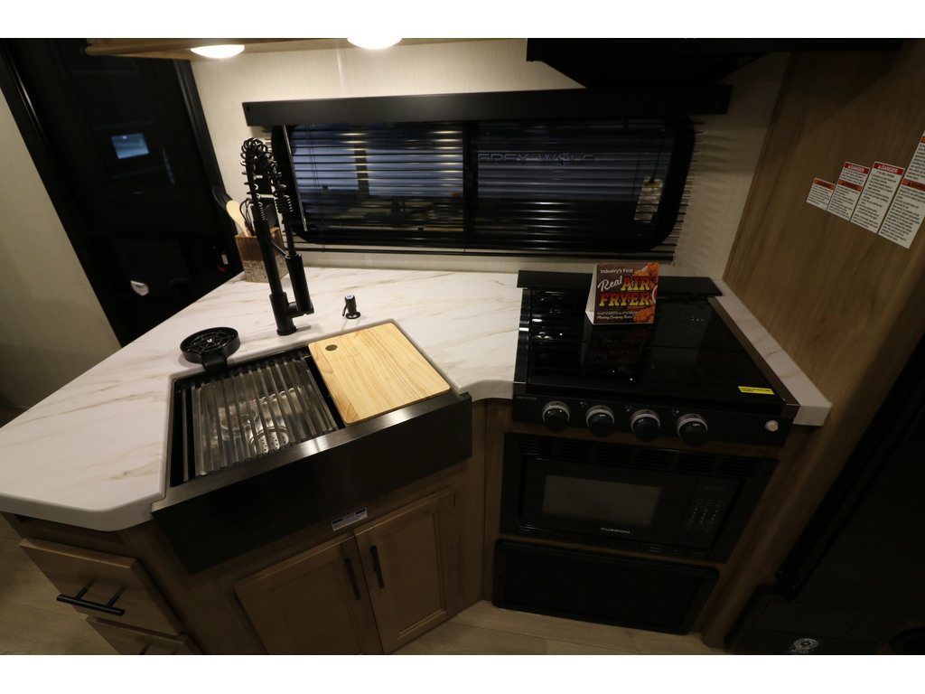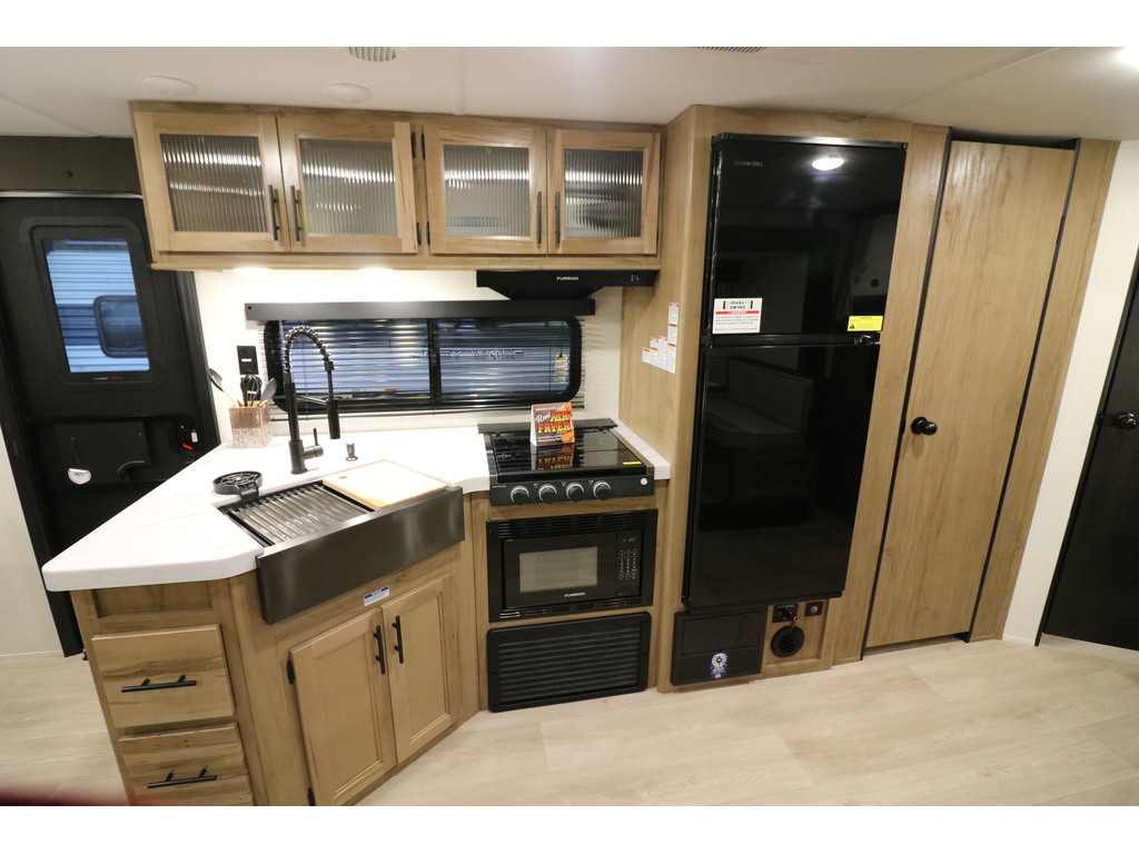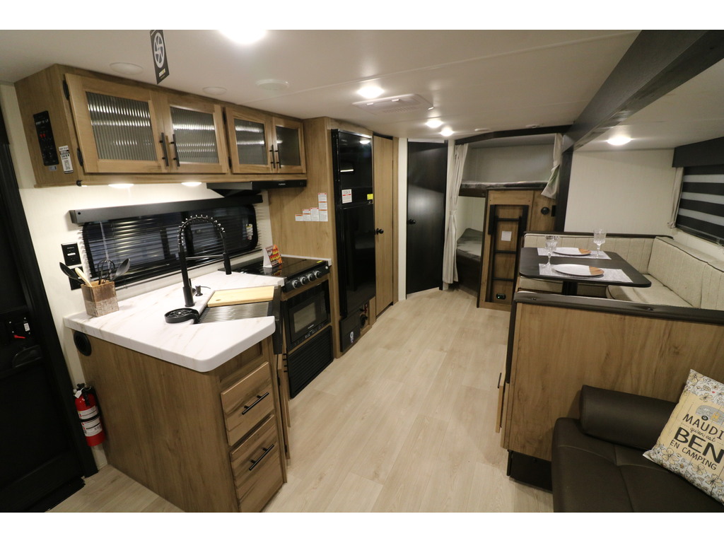 Nouvel arrivage à venir !!! Grey Wolf 26DBH 2025 Roulotte idéale pour la famille. Elle est complètement équipée avec un poids de seulement 5700 lbs. Elle a une extension double avec sofa lit et banquette en "U". Pour une plus grande intimité, la chambre avant a de vraies portes et à l'arrière il y a des lits superposés double avec une échelle pour faciliter l'accès. Très pratique, la grande salle de bain a une porte donnant sur l'extérieur. La cuisine a beaucoup de commodité tel qu'un grand évier, 3 ronds de poêle, un réfrigérateur, micro-ondes convection et air fryer ainsi qu'un grand garde-manger. Cette roulotte est parfaite pour passer du bon temps à l'extérieur grâce à l'auvent électrique et à la petite cuisine extérieure. Le support arrière peut être pratique pour le transport des vélos ou autres articles (jeux pour les enfants, bois pour les feux). Cette roulotte a une très belle finition intérieure avec dosseret de cuisine et foyer électrique. Elle est la plus vendue de sa catégorie. Financement facile sur place. photos à titre indicatif