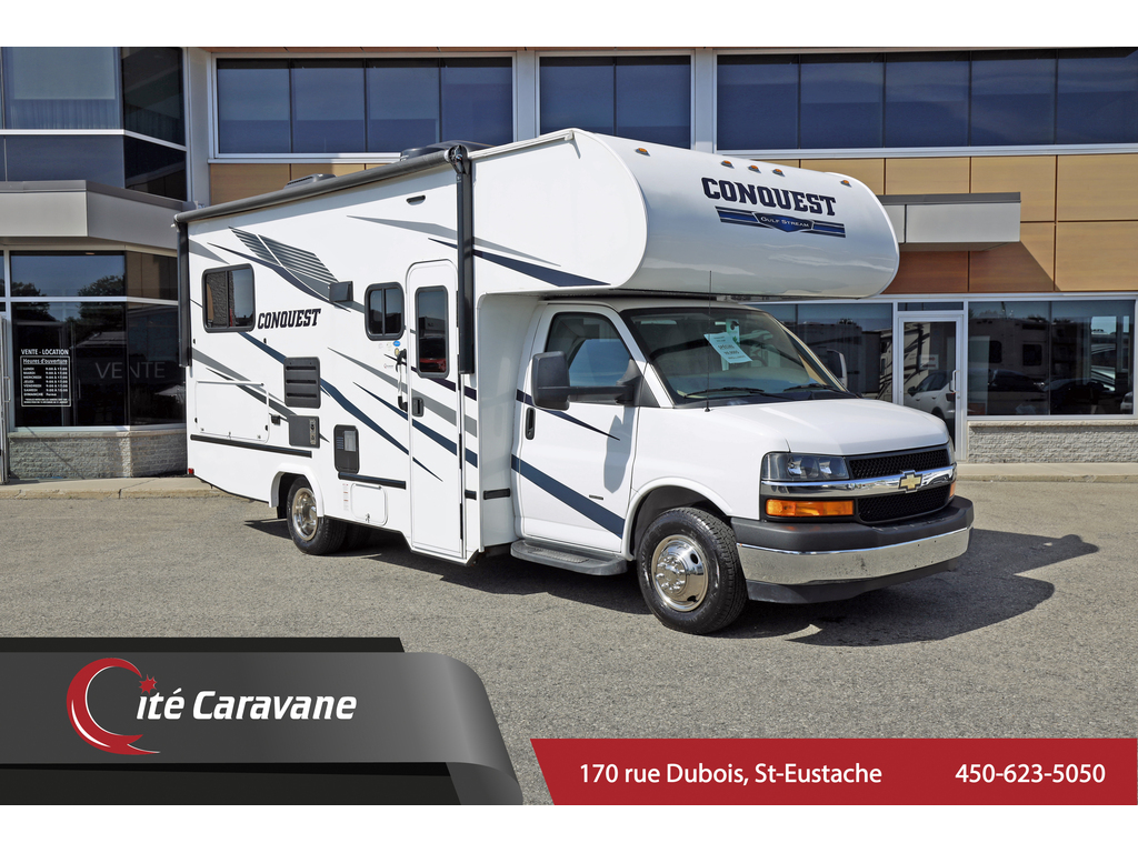 Gulfstream Conquest 6237 ! Classe C 24 pieds , Couche 6 personnes, ,Gm 6.0L carburant : à essence. EXTÉRIEUR : Blanc, Revêtement de fibre,, Jantes en acier avec enjoliveur, Grande auvent électrique, Génératrice à essence 4000 Watts Onan, Lumière de service, 30 ampères, Prise de câble, Ouverture des coffres par le coté et le haut, réservoir propane , batterie auxiliaire, Attache-remorque de 5,000 lb, Toit de type TPO. INTÉRIEUR : Réfrigérateur 10 pi.cu. , Évier, Micro-onde, Dinette avec banquettes, sofa en cuirette, . Lit Queen dans la chambre des maîtres, Garde-robe, belle grande douche Réservoir d'eau chaude au propane, Lit au-dessus du poste de conduite, Revêtement de sol en prélart, Air climatisé de 13,500 BTU, Fournaise de 25,000 BTU, Lumières DEL, Rideaux de nuit , 889$+txs/MOIS www.citecaravane.com 450-623-5050 170 rue dubois , st-eustache J7P 4W9 Gulfstream Conquest 6237 !Class C 24 feet , sleeps 6 people, GM 6.0L , fuel: gasoline. EXTERIOR: white, Fiber coating, Steel rims with hubcaps, Large electric awning, 4000 Watt Onan gasoline generator, Service light, 30 amps, Cable socket, Trunk opening from the side and top, propane tank, auxiliary batterie, 5,000 lb trailer hitch, TPO type roof. INTERIOR: 10 cu.ft. refrigerator , big sink, Microwave, Dinette with benches, leatherette sofa, Queen bed in master bedroom, Closet, beautiful large shower Propane hot water tank, Bed above operator position, Linoleium flooring, Air conditioning 13,500 BTU, Furnace of 25,000 BTU, Lights LED, Night curtains, 889$ + txs / MONTH www.citecaravane.com 450-623-5050 170 rue dubois, st-eustache J7P 4W9