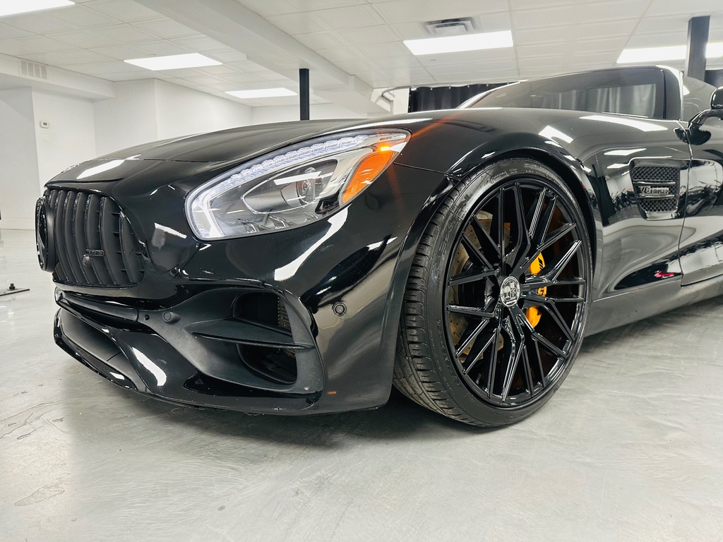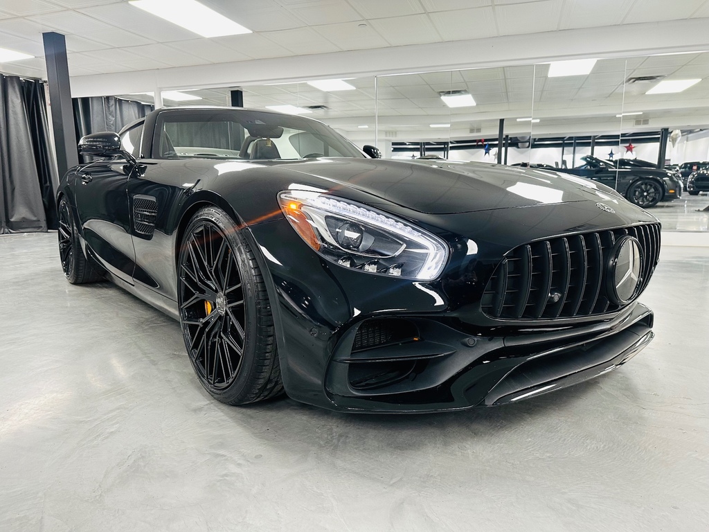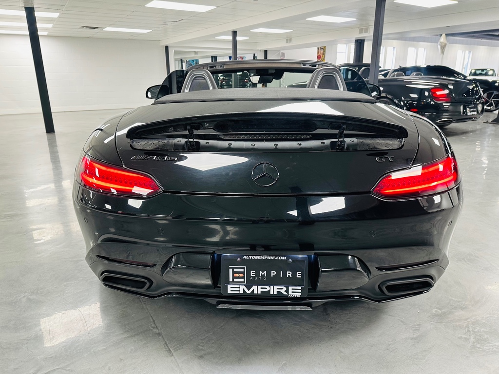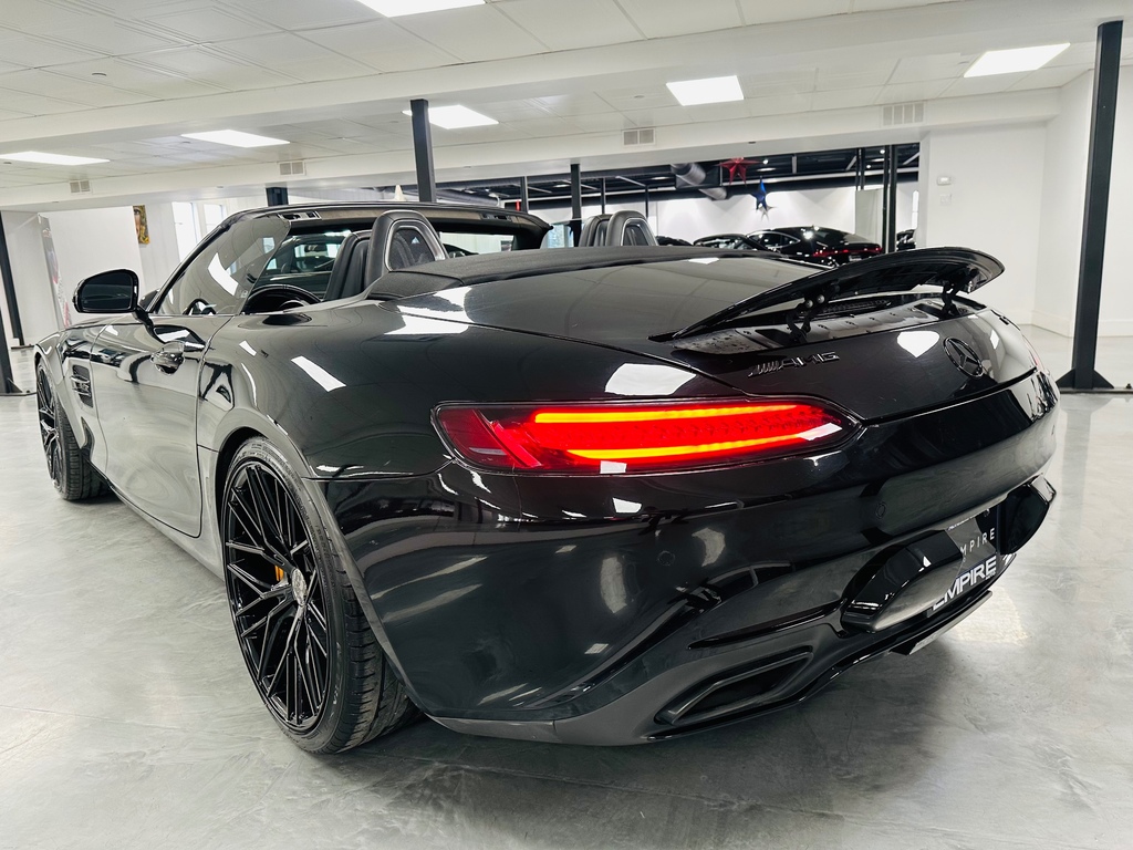 2018 AMG GT ROADSTER NOIR SUR NOIR SUSPENSION RABAISSE DE 1 POUCE ETRIER DE FREINS ORANGE AMG ROUES NOIR LUSTRE TOIT CONVERTIBLE SOUPLE MOTEUR V8 4.0L BITURBO DE 550HP AVEC UNE LIGNE D'EXHAUST F i DONNANT UN SON TRES AGGRESSIF