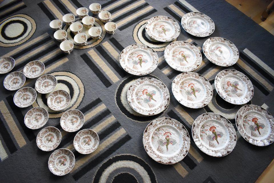 12 soucoupes, 12 tasses et 12 assiettes + 1 Grand plateau En très bon état (sauf une tasse qui est ébréchée)