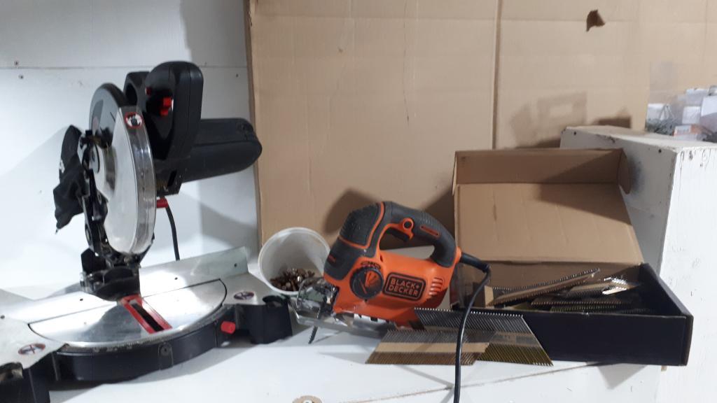scies À onglet, sauteuse et clous À vendre scie à onglet à angle portative marque: jobmate, lame neuve scie sauteuse back&decker curve control ¾ boite clous en bande 2.5 à 3.5po divers très bonne conditi...
