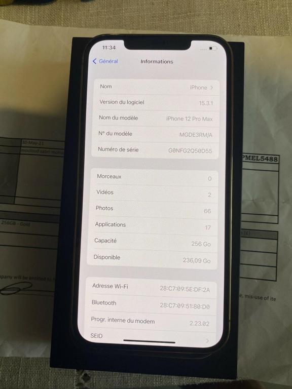 Je mets en vente mon Apple iPhone 12 Pro Max - 256 Go - Or état Nikel. Contacté