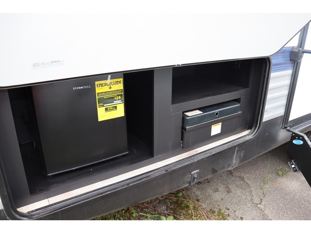 Options : Réservoir de propane, Climatiseur au plafond, Ventilateur au plafond, Vérin stabilisateur, Douche, Toilette, Lit queen-size, Lit double, Canapé-lit, Prise électrique, Détecteur LPG/CO2, Téléviseur, Chaine stéréo, Prise cable, Micro-onde, Cuisinière, Four, Hotte, Auvent, Chauffe-eau