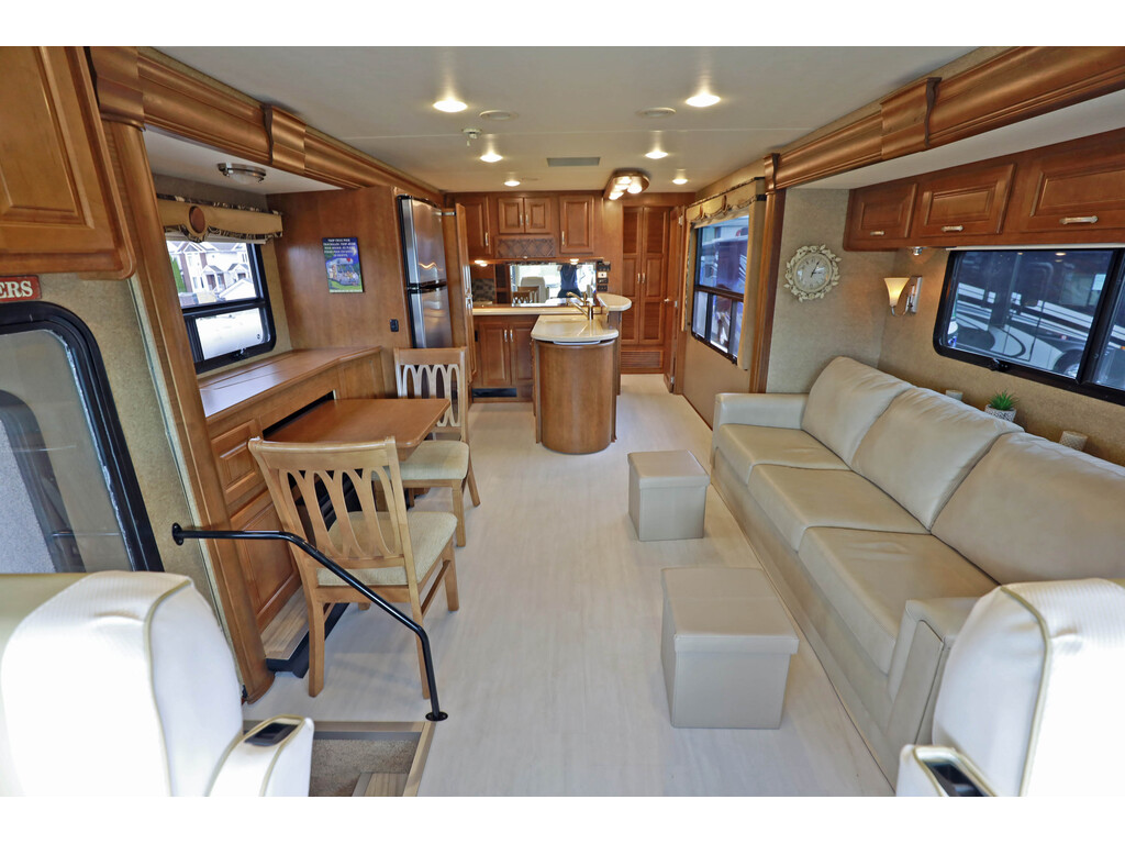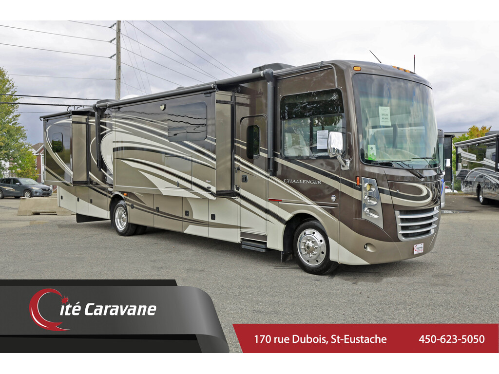 vente en cours - sale pending Thor Challenger 37GT 2014, WOW un vr impeccable ! Motorisé Classe A de 38 pieds construit sur châssis Ford V10, avec extérieur full paint en excellente condition. Son plan de plancher avec 3 extensions offre une cuisine en « L » avec un grande superficie de comptoirs, réfrigérateur résidentiel, micro-ondes et cuisinière, ouverte sur un vaste salon comprenant sofa convertible, fauteuils confortables et téléviseur rétractable. La chambre des maîtres fermée propose un grand lit et beaucoup de rangement, tandis que la salle de bain complète dispose d’une douche pleine grandeur en coin. Ce VR est équipé d’une génératrice intégrée, de laveuse / sécheuse, de la climatisation centrale ( 2 unités au toit ), du chauffage central et d’un auvent électrique. Un véhicule luxueux, sur un châssis avec roues de 22,5 pouces et des coffres de style full basement. ---------------------------------------------------------------------------------------------------------------------------------------------------------------------------------------------------------- 2014 Thor Challenger 37GT, WOW ultra clean RV! Class A motorhome built on a Ford V10 chassis, with a full paint exterior in excellent condition. Its floor plan with 3 slide-out offers an "L" shaped kitchen with a large countertop area, residential refrigerator, microwave and stove, opening onto a spacious living room including a convertible sofa and a retractable television. The enclosed master bedroom offers a large bed and plenty of storage, while the full bathroom has a full-size corner shower. This RV is equipped with a built-in generator, washer/dryer, ducted air conditioning (2 roof units), central heating and an electric awning. A luxurious RV, on a chassis with 22.5-inch wheels and full basement-style storage.